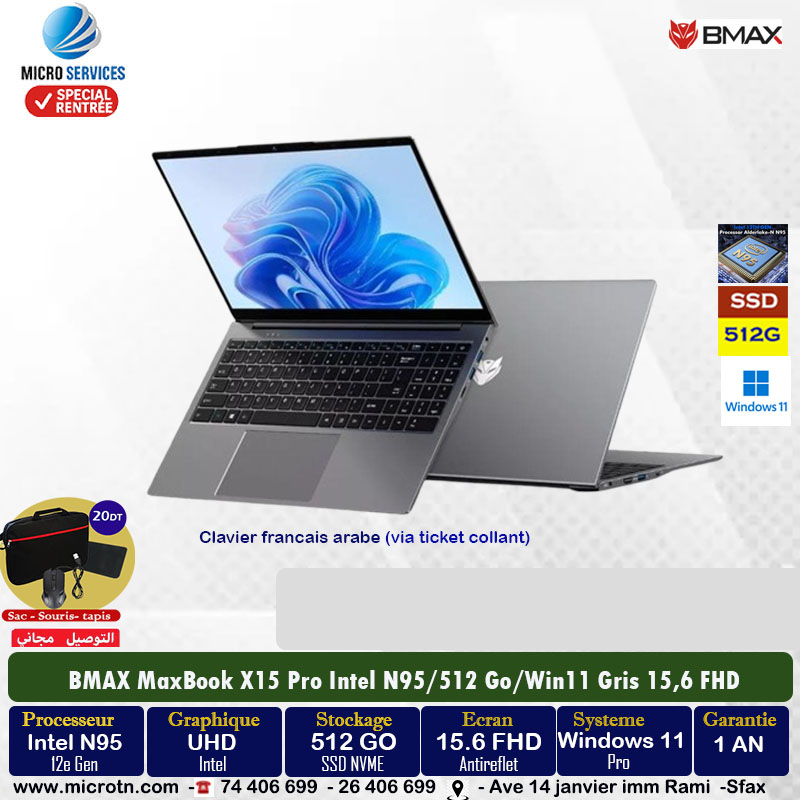 Écran 15.6" Full HD,LCD IPS - Processeur: Intel® N95 de 12è Génération (Up to 3.40 GHz Turbo max, 6Mo de mémoire cache, Quad-Core) - Système d'exploitation: Windows 11 Pro - Mémoire RAM: 16 Go LPDDR4 - Disque Dur: 512 Go SSD - Carte Graphique: Intel UHD Graphics avec Wi-Fi, Bluetooth, 3x USB 3.0, 1x HDMI, Prise casque stéréo 3,5 mm - Clavier pleine taille - Couleur: Gris - Garantie: 1 an
