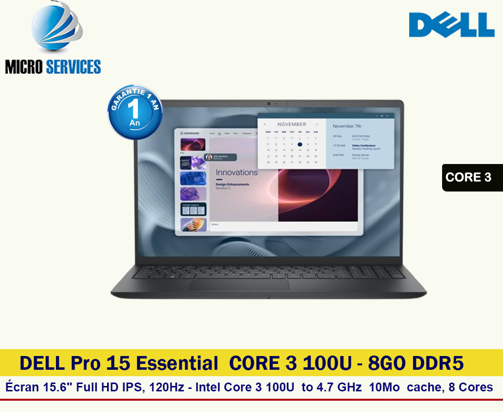 PC Portable DELL Pro 15 Essential PV15250 Core 3 100U 8Go 256Go SSD