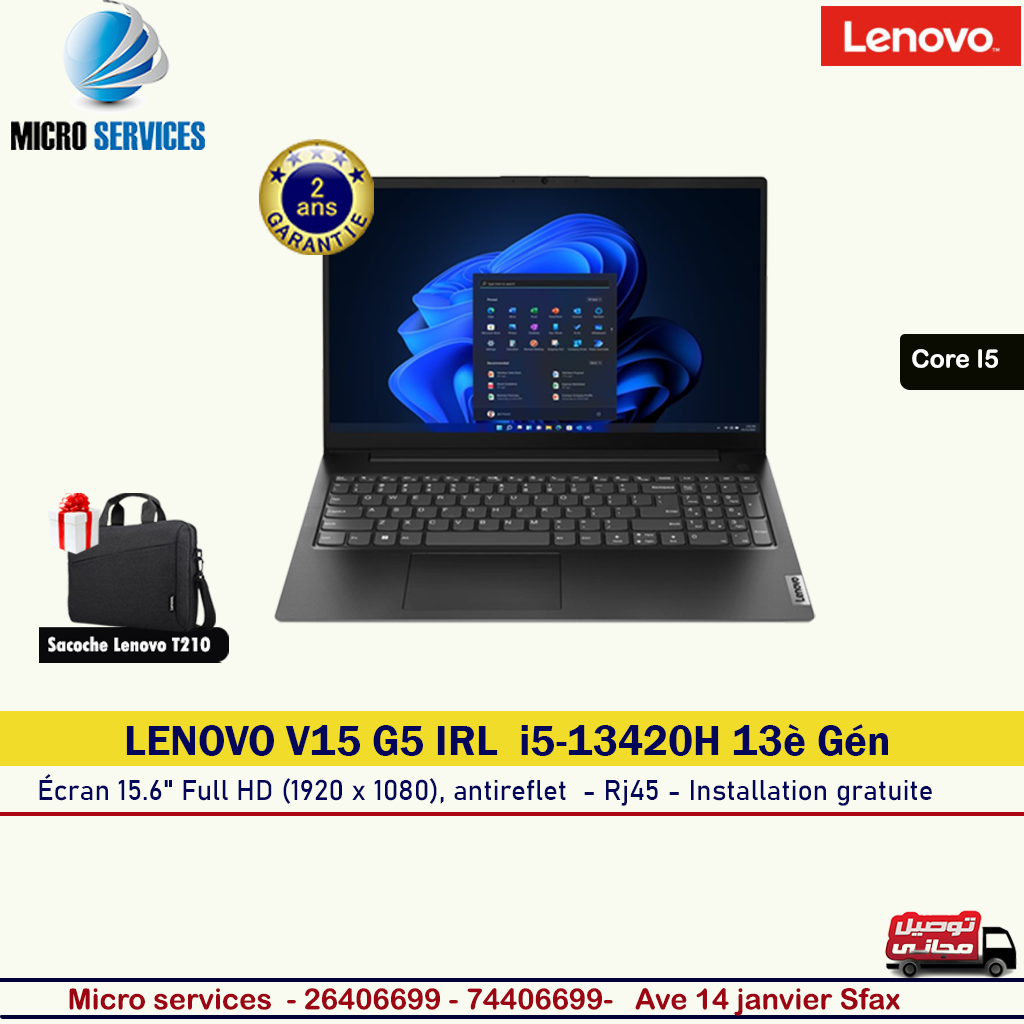 Pc Portable Lenovo V15 G5 IRL - Ecran : 15.6" FULL HD (1920 x 1080) TN 250 nits, antireflet, 45 % NTSC - Processeur : Intel Core i5-13420H(Up to 4,6 GHz , 12 Mo de mémoire cache, 8 Cœurs) - Mémoire RAM : 12Go DRR5 - Disque Dur : 512Go SSD - Carte Graphique : Intel UHD intégrée avec Wi-Fi 6, Bluetooth 5.2 - 2 ports USB-A (USB 5 Gbit/s / USB 3.2 Gen 1), 1 port USB-C (USB 5 Gbit/s / USB 3.2 Gen 1), avec alimentation USB (20 V uniquement) et DisplayPort 1.2, 1 port HDMI 1.4b, 1 prise combo casque/microphone (3,5 mm), 1 port Ethernet (RJ-45), 1 connecteur d'alimentation - 2x Haut-parleurs stéréo, 1,5 W et microphone intégré - Caméra HD 720p avec obturateur de confidentialité - Couleur : Noir - Garantie : 2 ans