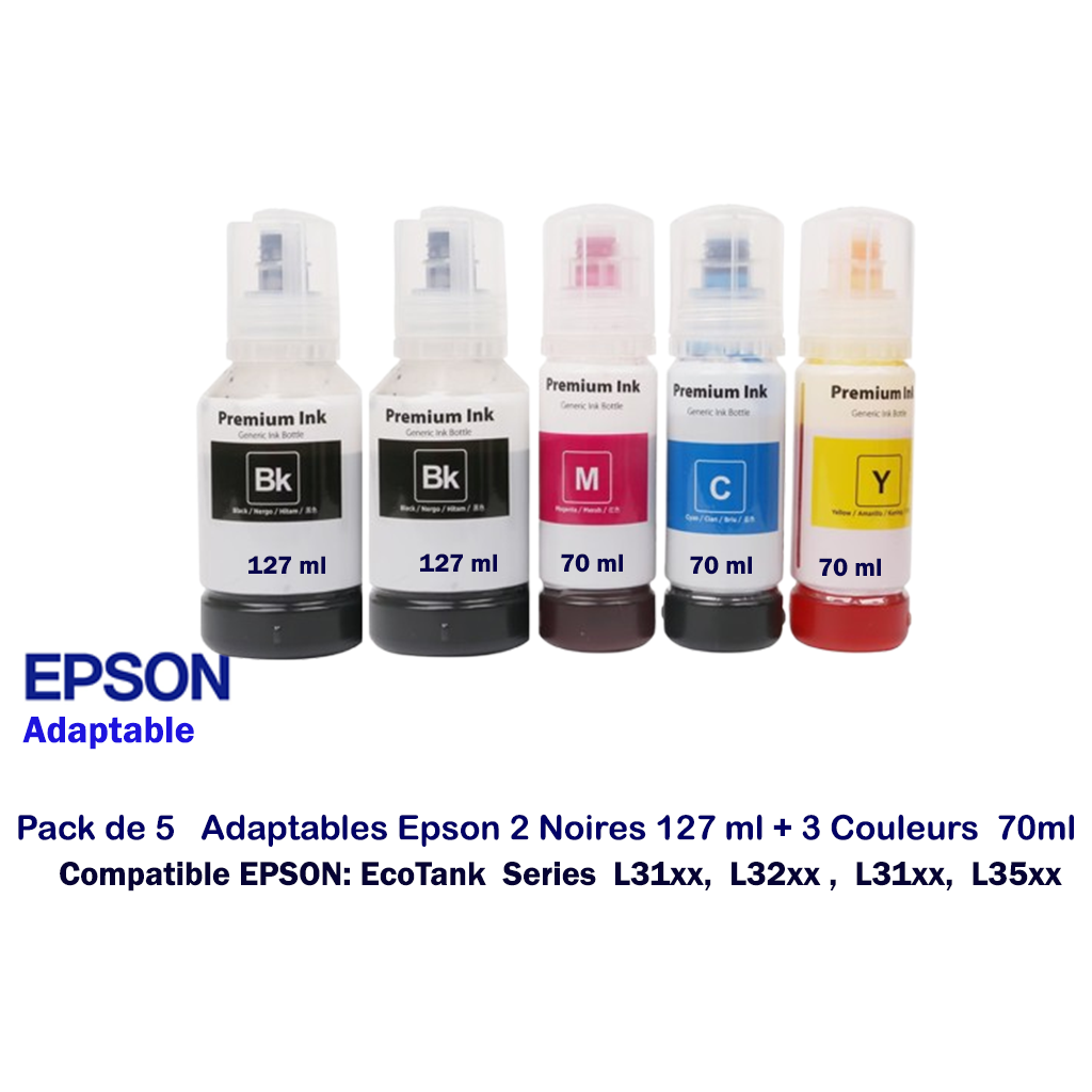 5 Bouteille D'encre Adaptable - Technologie d'impression: Jet d'encre - Capacité: 70ml - Compatible avec: Epson EcoTank Epson EcoTank L3150 , EcoTank L3110 - L3251 - L3250 - L3210 - L6190 ... Couleur: 2Noir 127ml -1 jaune 70ml - 1 rouge 70 ml-1bleu 70ml