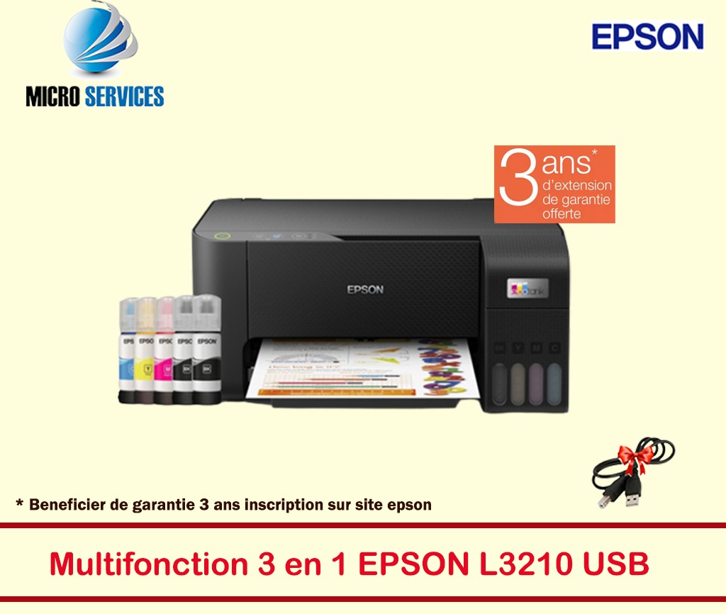 Imprimante à Réservoir Intégré EPSON ECOTANK L3210 - Fonction: Impression, Copie, Numérisation - Technologie d'impression: Jet d'encre (tête d'impression Epson Micro Piezo) - Vitesse d'impression (N&B/Couleur): 33 pages/min , 15 pages/min - Qualité d'impression noir: 5.760 x 1.440 DPI (ppp) - Qualité d'impression couleur: 5.760 x 1.440 DPI (ppp) - Vitesse de Numérisation: 11 s noir (200 DPI) / 32 s couleur (200 DPI) - Impression recto/verso: Manuel - Format Papier: A4 - Interface: USB - Capacité Papier: 30 feuilles - Dimensions: 375 x 347 x 179 mm - Poids: 3.9 kg - Garantie: 1 an