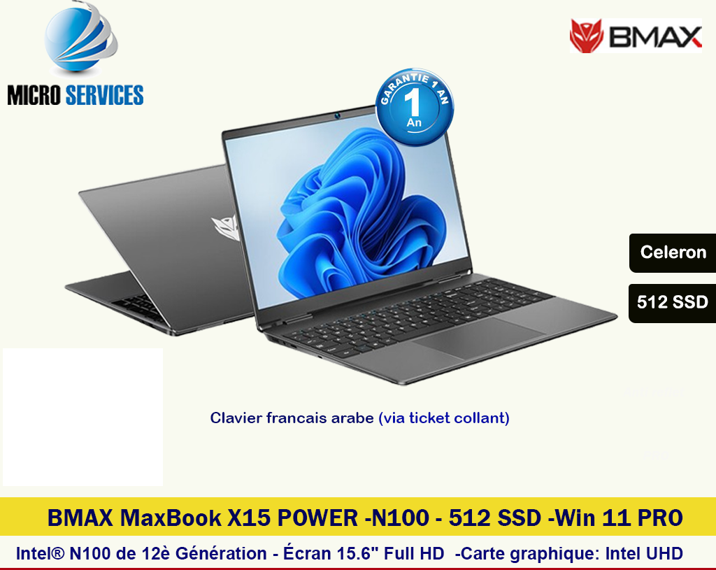 PC Portable BMAX MaxBook X15 Pro Intel N100 12è Gén 8Go 512Go SSD